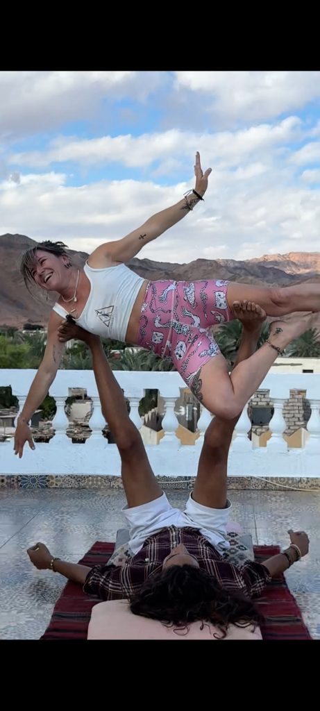 5 years ago, acroyoga found me in New Caledonia. Conventions across Egypt, Europe, and Argentina shaped my practice. Since moving to Dahab 6 months ago, I’ve been teaching and sharing the joy of this practice, the trust, the play, the deep connection of lifting each other up.